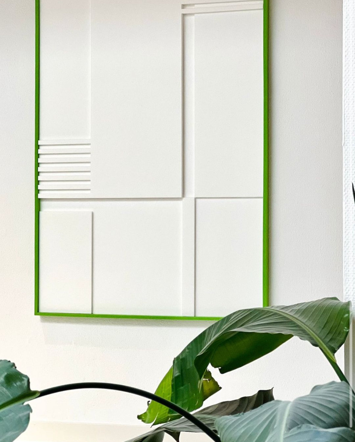 The colours from the pop of colour line are real eye-catchers. This Pure Green emerged from a beautiful collaboration and was then used as a frame for an ivory coloured artwork. |