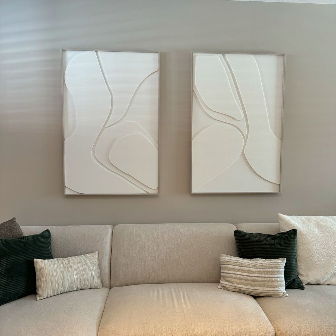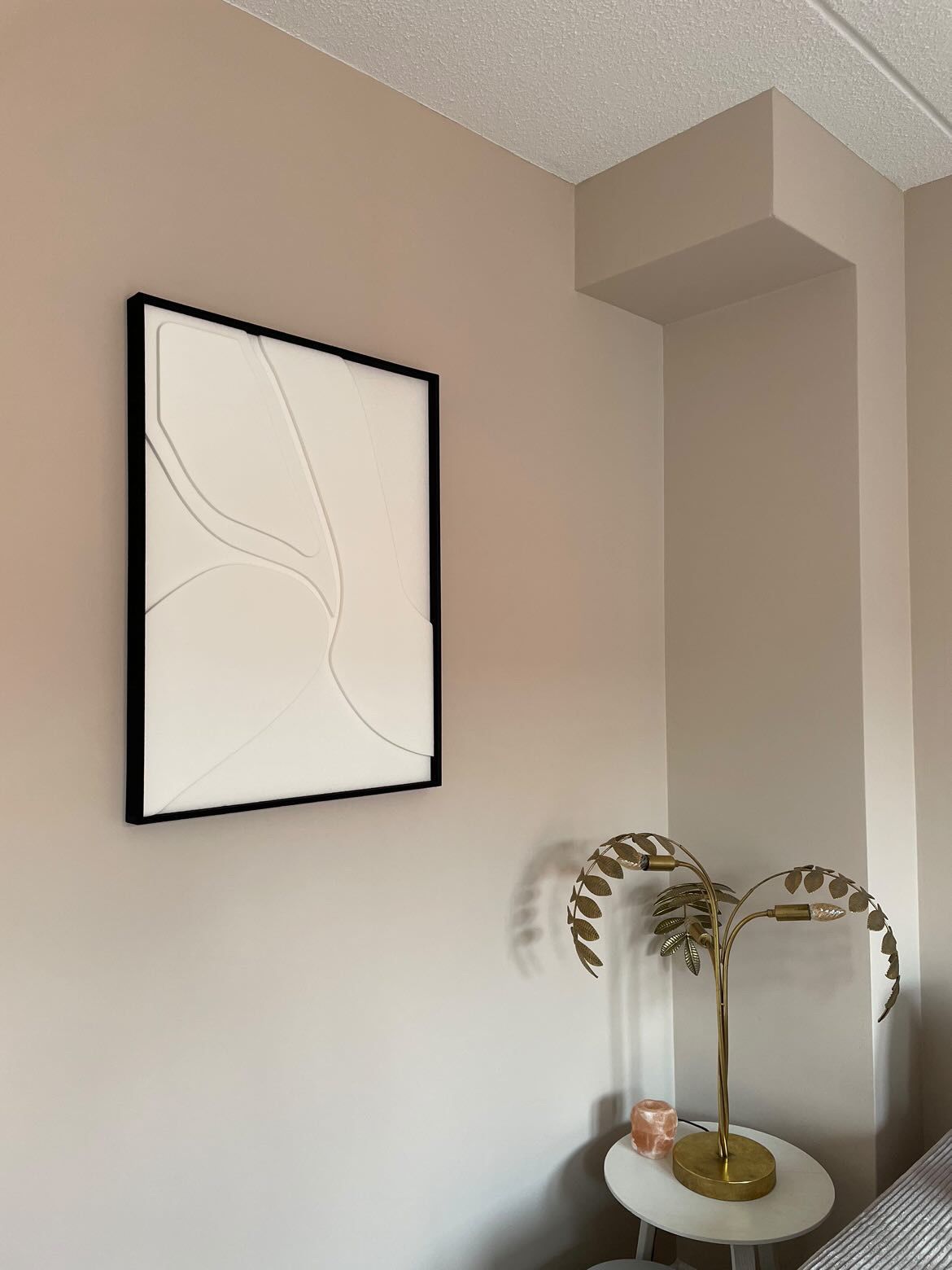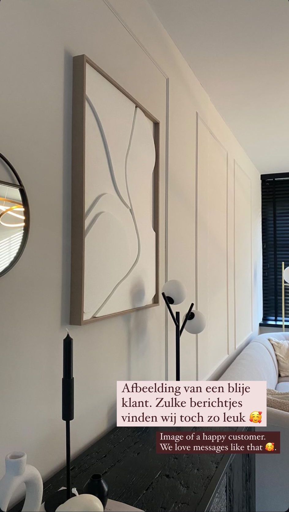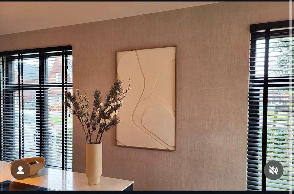 Ivory is a soft, white colour that is best compared to off-white. This colour is easy to combine with other colours and, due to its light and neutral appearance, it looks good in interiors with light elements. Think of interior styles: Scandinavian, minimalist, Japandi, bohemian (rattan), Mediterranean, but also shabby chic, rural and romantic. Do you want a light addition to your interior? Then you are completely right with your Piece of Art in the colour Ivory. In terms of combinations, it works well with the colour Earthy Beige, but in combination with a black frame you get a tough look that beautifully outlines the work.