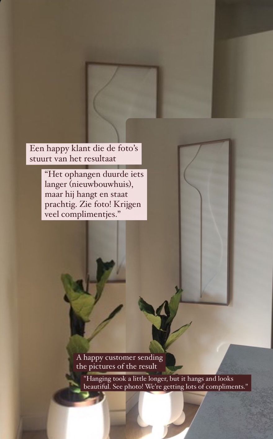Wij zijn goed geholpen en ze hangen exact. Heel gaaf! In het echt nog mooier in de ruimte. Bedankt!