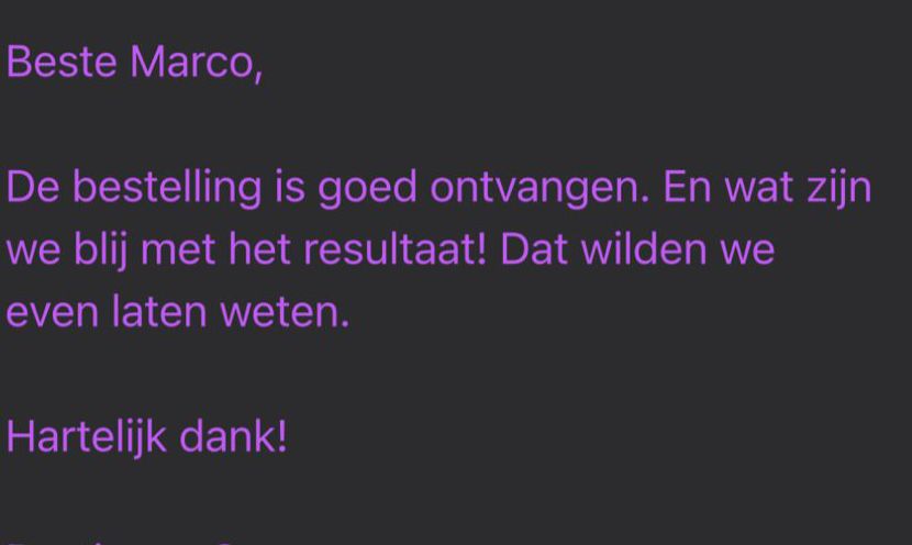 We hebben de stukken ontvangen, ze zijn super mooi geworden. We zijn er heel blij mee!